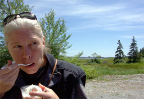 So, you know how dreadful you feel after a big puking bout. Teri is such a trroper, she got right on the bike (we didn't have much choice, Customs is always suspicious of people who don't want to go through) and we drove for an hour till we found some food she could tolerate. After eating a quart of strawberies from a roadside stand and topping off with some ice cream, she started to come around. | ||||||||